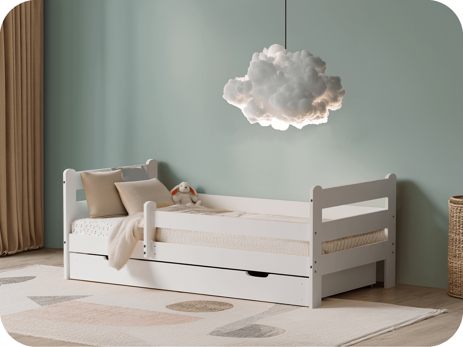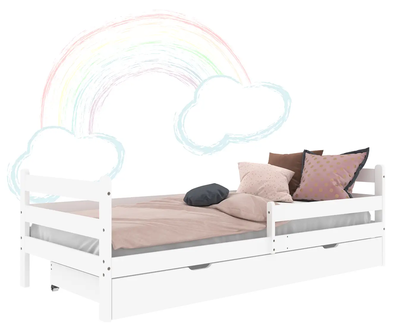 Vďaka možnosti inštalácie zábradlia na pravú alebo ľavú stranu môžete pokojne spať s vedomím, že vaše dieťa spí bezpečne. Zábradlie poskytuje dodatočnú ochranu, kým nebude vaše dieťa pripravené zaspať samo. Naša posteľ Kacperek je vybavená aj zásuvkou na kolieskach, ktorá umožňuje ľahký prístup k uloženým veciam a zároveň šetrí cenné miesto v izbe.