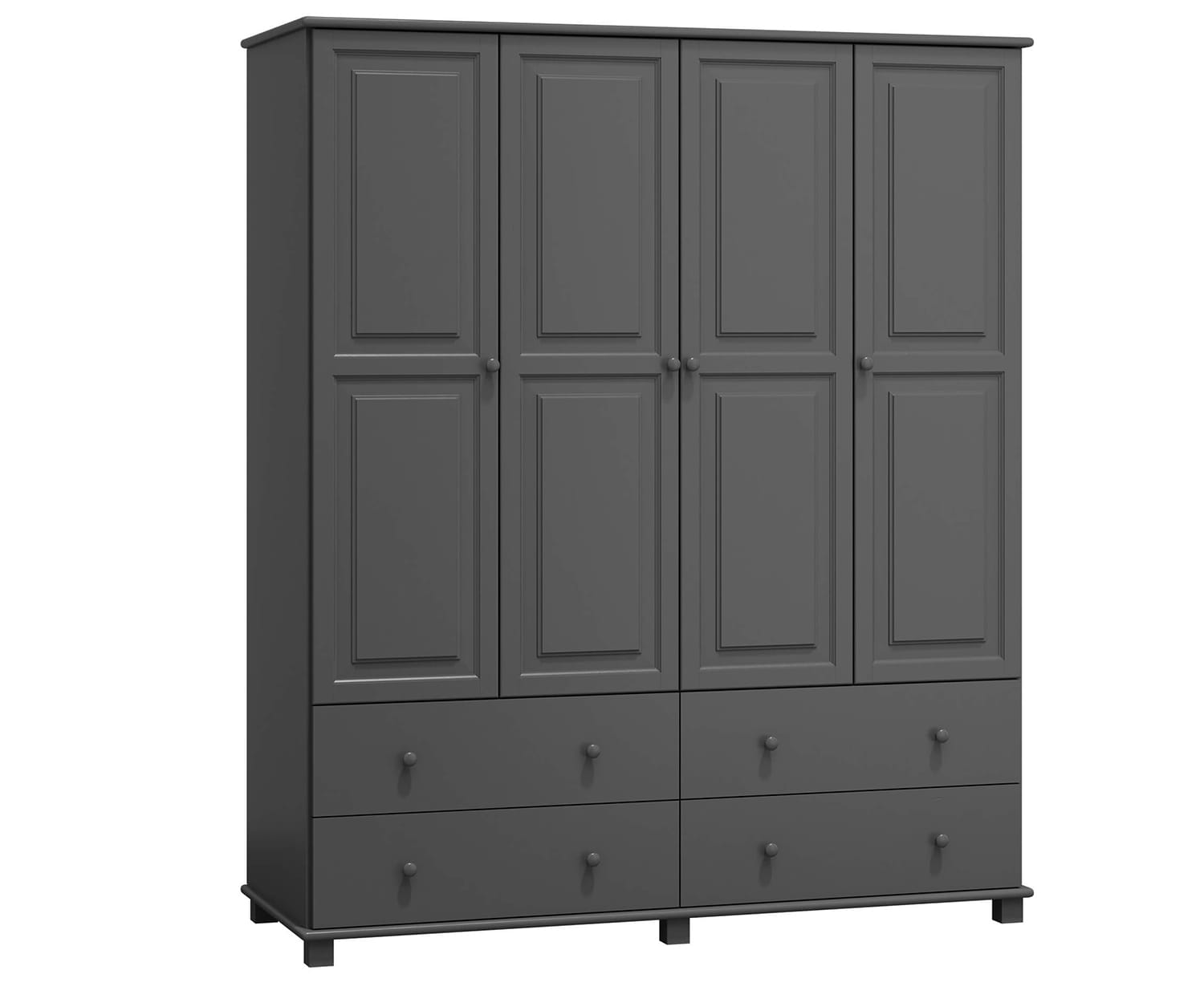 Skříň 4Dč6 šedá šířka 180 má díky použití borovicového dřeva odolnou a stabilní konstrukci. Nábytek je vyroben z borovicového dřeva nejlepší kvality a natřen 3 vrstvami ekologického laku. Jako jedni z mála používáme při výrobě laky, které mají certifikát Státní hygienické stanice. Laky, které používáme, jsou schváleny pro použití na předmětech, s kterými přicházejí do styku děti (shoda s normou DIN EN 71, č. 3). Výrobek je dodáván v balících a je určen pro samostatnou montáž. |