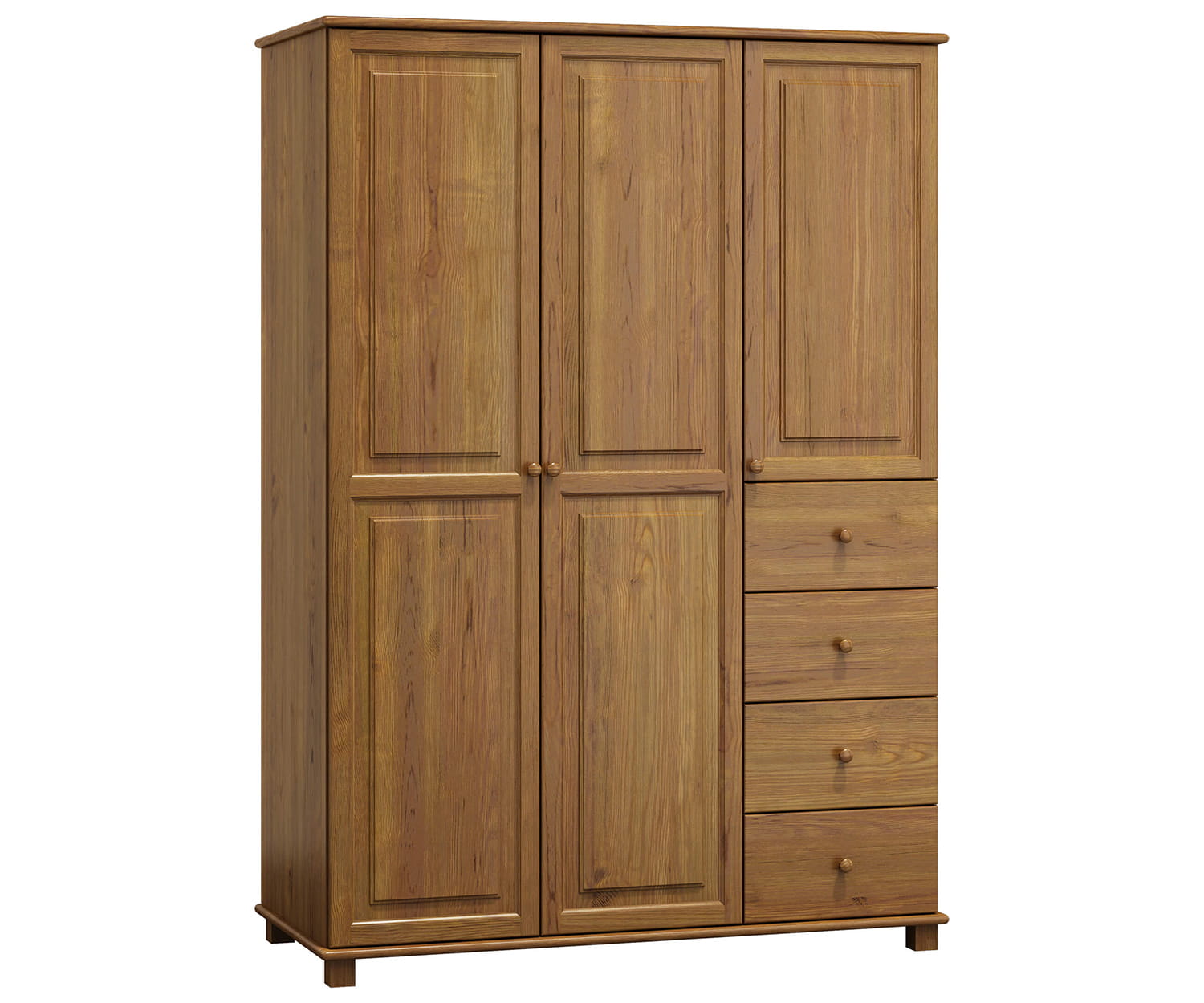 Skříň 3Dč4 šířka 120 má díky použití borovicového dřeva odolnou a stabilní konstrukci. Nábytek je vyroben z borovicového dřeva nejlepší kvality a natřen 3 vrstvami ekologického laku. Jako jedni z mála používáme při výrobě laky, které mají certifikát Státní hygienické stanice. Laky, které používáme, jsou schváleny pro použití na předmětech, s kterými přicházejí do styku děti (shoda s normou DIN EN 71, č. 3). Výrobek je dodáván v balících a je určen pro samostatnou montáž. |