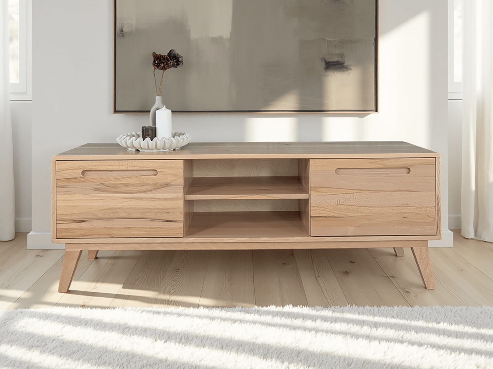TV skrinka z bukového dreva zaujme nielen svojim vzhľadom, ale aj funkčnosťou. Má dve priestranné skrinky s policami vo vnútri, čo umožňuje uloženie rôznych predmetov. Pozoruhodné sú pánty, ktoré sú namontované na spoľahlivých vodidlách Blum s mäkkým zatváraním, vďaka ktorým je otváranie a zatváranie skriniek plynulé a tiché. Navyše, na strategickom mieste, uprostred nábytku, je otvorená polica, ideálna na umiestnenie modemu, hernej konzoly alebo iných zariadení. Konštrukcia TV skrinky je vyrobená z masívneho bukového dreva, čo zaručuje nielen estetiku, ale aj mimoriadnu odolnosť.